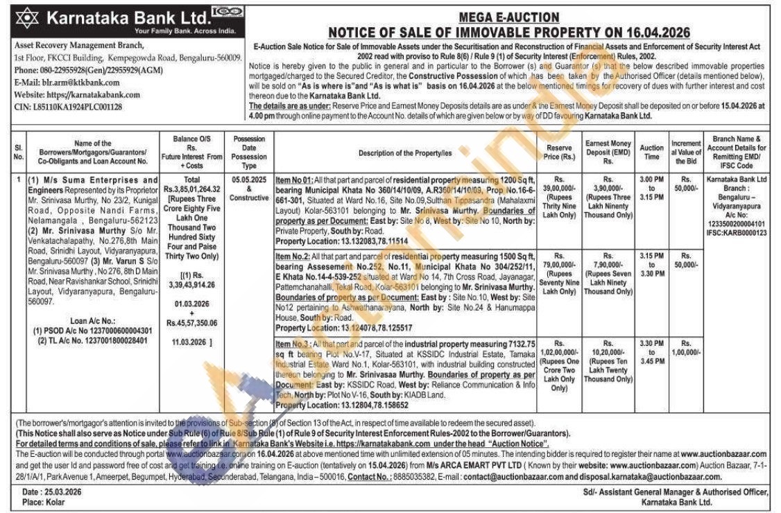 Item No 01; All that part and parcel of residential property measuring 1200 Sq ft, bearing Municipal Khata No 360/14/10/09, A.R360/14/10/09, Prop No.16-6-661-301, Situated at Ward No. 16, Site No.09, Sulthan Tippasandra (Mahalaxmi Layout) Kolar-563101 belonging to Mr. Srinivasa Murthy. Boundaries of property as per Document: East by: Site No 8, West by: Site No 10, North by: Private Property, South by: Road. Property Location: 13.132083,78.11514