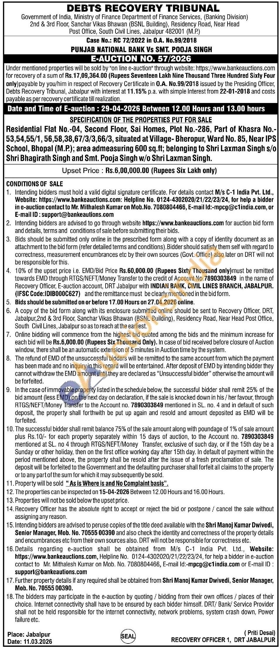 SPECIFICATION OF THE PROPERTIES PUT FOR SALE : Residential Flat No.-04, Second Floor, Sai Homes, Plot No.-286, Part of Khasra No.-53,54,55/1, 56,58,38,67/3/3,66/3, situated at Village-Bheropur, Ward No. 85, Near IPS School, Bhopal (M.P.); area admeasuring 600 sq.ft; belonging to Shri Laxman Singh s/o Shri Bhagirath Singh and Smt. Pooja Singh w/o Shri Laxman Singh