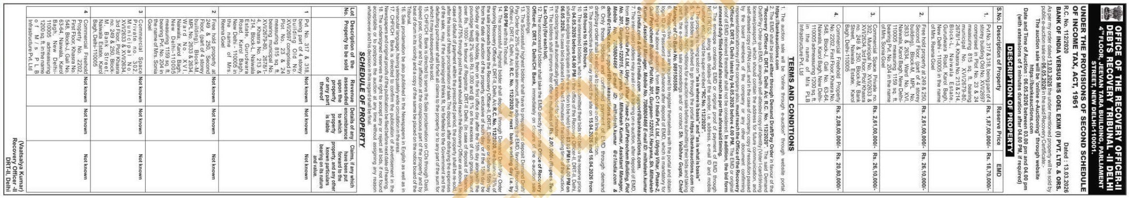 Commercial Freehold Property No. 2202, First Floor, Khasra No. 548. Block-J. Gali No. 63-64, Naiwala, Karol Bagh, New Delhi-110005 admeasuring 1200 sq. ft. in the name of Mis PLB Infrastructure Pvt. Ltd