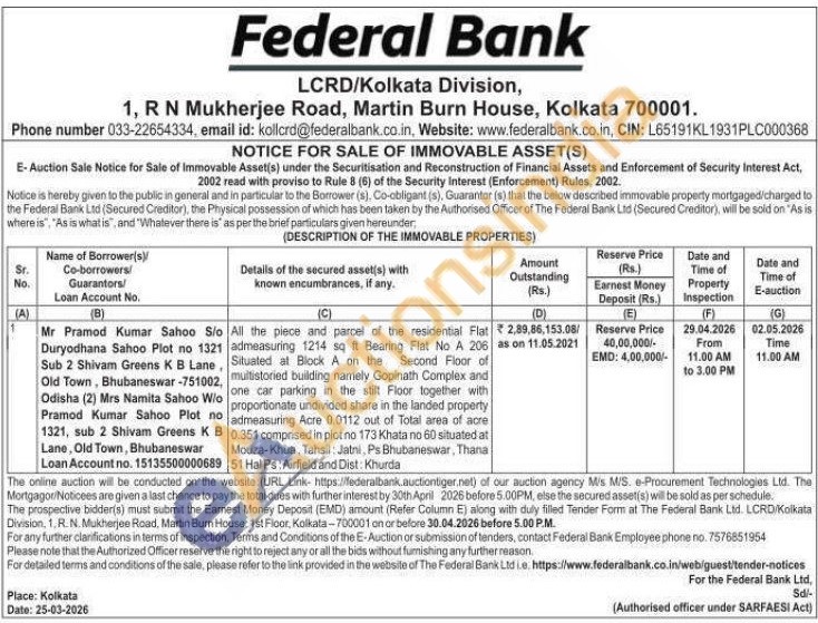 All the piece and parcel of the residential Flat admeasuring 1214 sq ft Bearing Flat No A 206 Situated at Block A on the Second Floor of multistoried building namely Gopinath Complex and one car parking in the stilt Floor together with proportionate undivided share in the landed property admeasuring Acre 0.0112 out of Total area of acre 0.351 comprised in plot no 173 Khata no 60 situated at Mouza-Khua, Tahsil: Jatni, Ps Bhubaneswar, Thana 51 Hal Ps: Airfield and Dist: Khurda