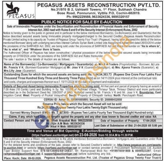 Details of Secured Asset being Immovable Properties which is being sold: All that part and parcel of property having an extent of 7.08 Ares (18 Cents) Land and Building in Sy. No. 1033/5 of Anthikad Village, Thrissur Taluk, Thrissur District and more particularly described as in the Settlement Deed No. 338/2007 of SRO, Anthikad owned by Mr. Francis VK and Mr. Jose VK Boundaries: East: Imigation Canal, West: Property of Popkat Velayudhan, South: Property of Chirayath Varkey, North: Panchayath Road