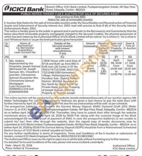 2 BHK House with Land Area of 8718 and Built-up Area 850 in 8.09 Ares (20 Cents) in SY No. 354/1/74/722/1046, 354/1/74/722/1046/1050 Karavaloor Village, Pathanapuram Taluk, Punaloor Sub-District, Kollam District-691504. Bounded on the: North by: Road, South by: Private Road, East by: Property of joseph Samuel, West by: Property of Thomas Joseph
