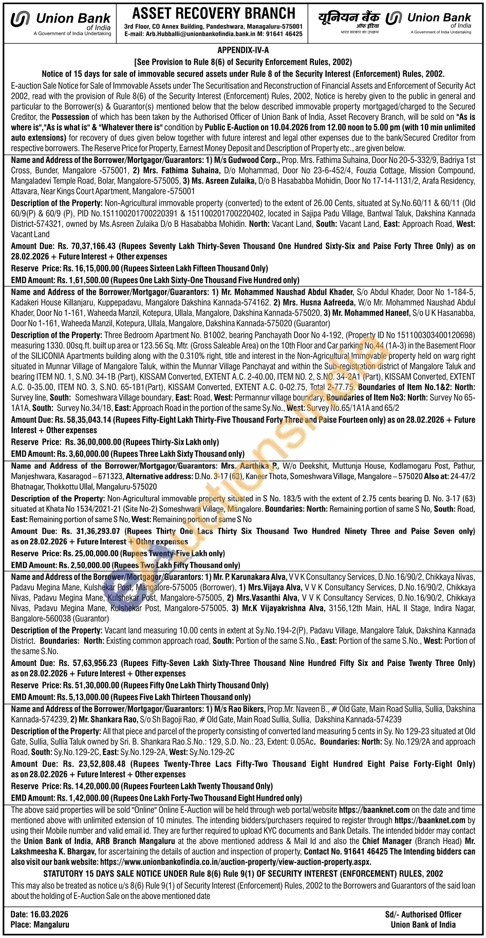 Description of the Property: Non-Agricultural immovable property situated in S No. 183/5 with the extent of 2.75 cents bearing D. No. 3-17 (63) situated at Khata No 1534/2021-21 (Site No-2) Someshwara Village, Mangalore. Boundaries: North: Remaining portion of same S No, South: Road, East: Remaining portion of same S No, West: Remaining portion of same S No