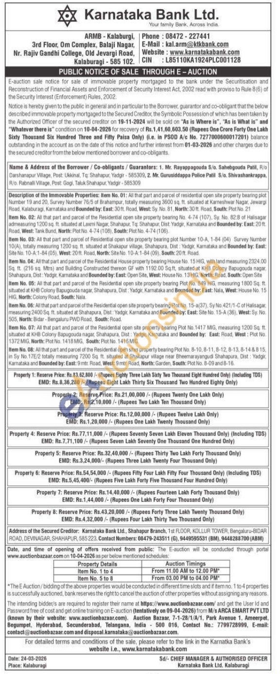 Item No. 07: All that part and parcel of the Residential open site property bearing Plot No. 1417 MIG, measuring 1200 Sq. ft. situated at KHB Colony Bapugouda nagar, Shahapura, Dist: Yadgir, Karnataka and Bounded by: East: Road, West: Plot No. 1372 MIG, North: Plot No. 1418 MIG, South: Plot No. 1416 MIG
