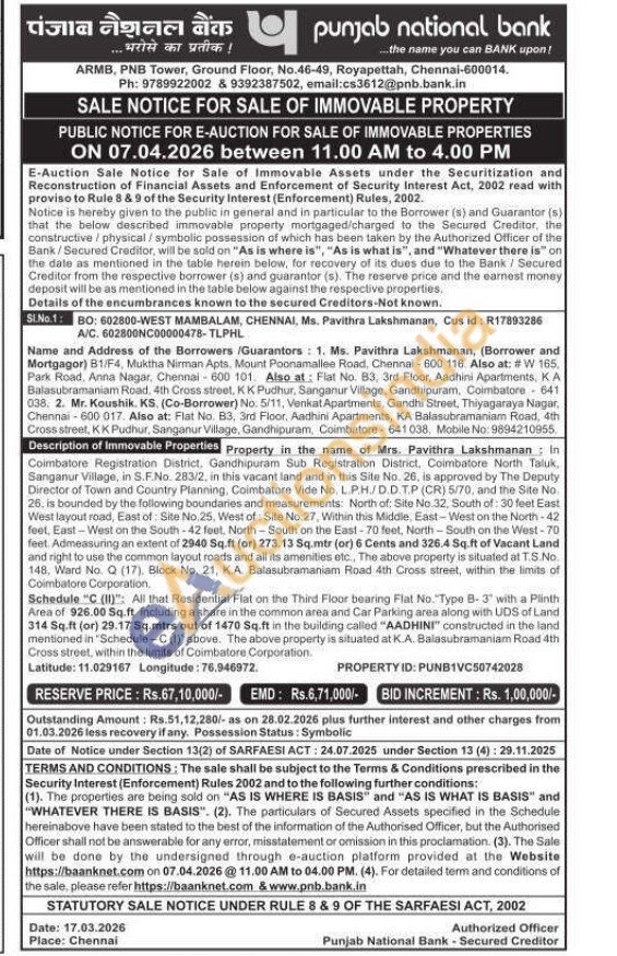 Property in the name of Mrs. Pavithra Lakshmanan in Coimbatore Registration District, Gandhipuram Sub Registration District, Coimbatore North Taluk, Sanganur Village, in S.F.No. 283/2, in this vacant land and in this Site No. 26, is approved by The Deputy Director of Town and Country Planning, Coimbatore Vide No. L.P.H./D.D.T.P (CR) 5/70, and the Site No 26, is bounded by the following boundaries and measurements: North of: Site No. 32, South of: 30 feet East West layout road, East of: Site No. 25, West of: Site No.27, Within this Middle, East-West on the North-42 feet. East-West on the South-42 feet North-South on the East-70 feet, North-South on the West-70 feet. Admeasuring an extent of 2940 Sq.ft (or) 273.13 Sq.mtr (or) 6 Cents and 326.4 Sq.ft of Vacant Land and right to use the common layout roads and all its amenities etc., The above property is situated at T.S.No. 148. Ward No. Q (17), Block No. 21, K.A. Balasubramaniam Road 4th Cross street, within the limits of Coimbatore Corporation. Schedule "C. (II)": All that Residential Flat on the Third Floor bearing Flat No. "Type B-3' with a Plinth Area of 926.00 Sq.ft including a share in the common area and Car Parking area along with UDS of Land 314 Sq.ft (or) 29.17 Sq.mtrs out of 1470 Sq.ft in the building called "AADHINI" constructed in the land mentioned in "Schedule-C (1) above. The above property is situated at K.A. Balasubramaniam Road 4th Cross street, within the limits of Coimbatore Corporation.