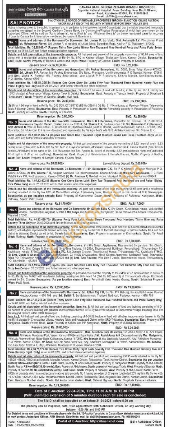 4) All part and parcel of the land measuring 05.56 ares and a residential building situated in Re Sy No 81/3 at Manantheri Village, Thalassery taluk, Kannur district in the name of C K Sarasappan. Boundaries as per location sketch: East: Property of Kunnummel Dasan, North: Property of Rafeeque Kaniyaran. West: Pathway, South: PWD Road,