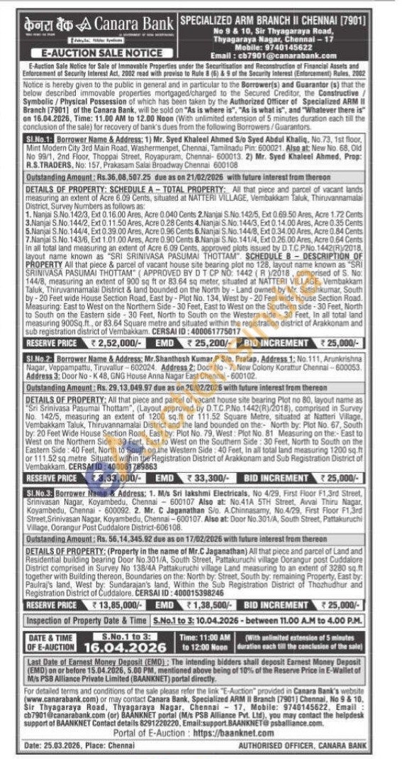 2) All that piece and parcel of vacant house site bearing Plot no 80, layout name as "Sri Srinivasa Pasumal Thottam", (Layout approved by D.TC.P.No. 1442(R)/2018), comprised in Survey No. 142/5, measuring an extent of 1200 sq.ft or 111.52 Square Metre, situated at at Natteri Village, Vembakkam Taluk, Thiruvannamalai District and the land bounded on the North by: Plot No. 67, South by: 20 Feet Wide House Section Road, East by: Plot No. 79, West: Plot No. 81 Measuring on the:-East to West on the Northern Side: 30 Feet, East to West on the Southern Side: 30 Feet, North to South on the Eastern Side: 40 Feet, North to South on the Western Side: 40 Feet, In all total land measuring 1200 sq.ft or 111.52 sq.metre Situated within the Registration District of Arakkunam and Sub Registration ation District of Vembakkam. CERSAI ID: 400061769863