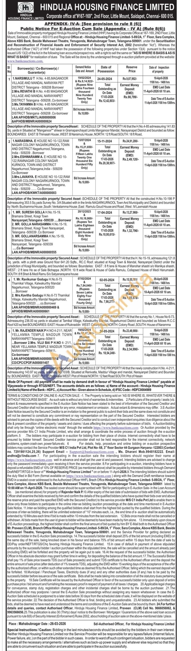 contact Authorised Officer, Hinduja Housing Finance Limited, Praveen (CLM) Cell No. 9666056062, & 9963566656
