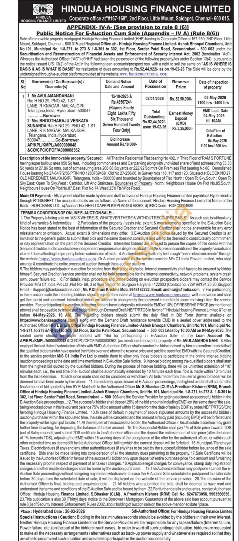 contact Authorised Officer, Hinduja Housing Finance Limited, S.Bhaskar (CLM), A.Preetham Kishore (RRM) Cell No. 8247673058, 9963566656