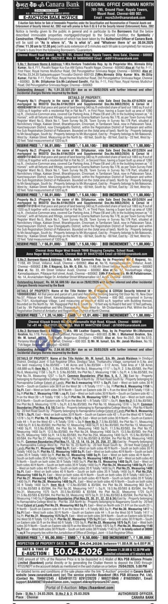 3) All that piece and parcel of land bearing 340 sq.ft undivided share of land out 1065 sq.ft out of 1320 sq.ft together with a residential Flat in Flat No.11, in Third Floor, having a Super built up area of 1280 sq.ft.. (Inclusive Common area, covered Car Parking Area, 3 Phase EB and Lift) in the building known as "15 Homes", with all fixtures and fittings, comprised in Grama Natham Survey No.178, as per Town Survey Field Register Ward No.G, Block No.1, Town Survey No.29. Town Survey in Survey No.178 Part, situated at Nemilichery Village, Kakkan Street, Bharathipuram, Chrompet, in Tambaram Taluk, now in Pallavaram Taluk, Kancheepuram District, now Chengalpattu District, within the Registration District of Tambaram and within the Sub Registration District of Pallavaram. Bounded on the (total area of land): North by: Property belongs to Mr.llavazhagan, South by: Property belongs to Mr. Murugavel, East by: Property belongs to Mr.Nakooran, West by: Kakkan Street. Measuring on the North by-60 feet, South by-60 feet, East by-22 feet, West by-22 feet. Total measurement of 1320 sq.ft.