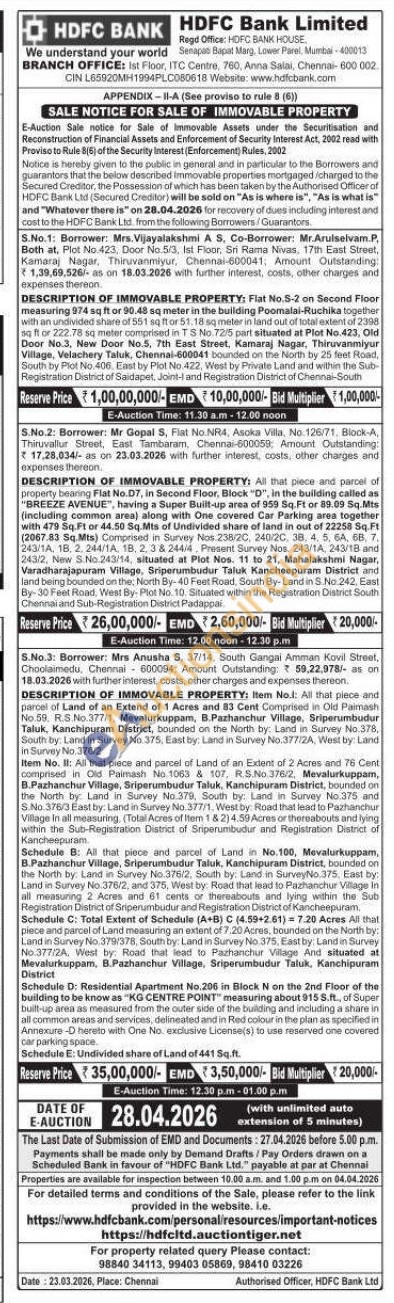 3) Item No.l: All that piece and parcel of Land of an Extend of 1 Acres and 83 Cent Comprised in Old Paimash No.59. R.S.No.377/1, Mevalurkuppam, B.Pazhanchur Village, Sriperumbudur Taluk, Kanchipuram District, bounded on the North by: Land in Survey No.378. South by: Land in Survey No. 375, East by: Land in Survey No.377/2A, West by: Land in Survey No. 376/2 Item No. II: All that piece and parcel of Land of an Extent of 2 Acres and 76 Cent comprised in Old Paimash No.1063 & 107, R.S.No.376/2, Mevalurkuppam, B.Pazhanchur Village, Sriperumbudur Taluk, Kanchipuram District, bounded on the North by: Land in Survey No.379, South by: Land in Survey No.375 and S.No. 376/3 East by: Land in Survey No 377/1, West by: Road that lead to Pazhanchur Village In all measuring (Total Acres of lten 1 & 2) 4.59 Acres or thereabouts and lying within the Sub-Registration District of Sriperumbudur and Registration District of Kancheepuram. Schedule B: All that piece and parcel of Land in No.100, Mevalurkuppam, B.Pazhanchur Village, Sriperumbudur Taluk, Kanchipuram District, bounded on the North by: Land in Survey No.376/2, South by: Land in SurveyNo.375, East by: Land in Survey No.376/2, and 375, West by: Road that lead to Pazhanchur Village In all measuring 2 Acres and 61 cents or thereabouts and lying within the Sub Registration District of Sriperumbudur and Registration District of Kancheepuram. Schedule C: Total Extent of Schedule (A+B) C (4.59+2.61) 7.20 Acres All that piece and parcel of Land measuring an extent of 7.20 Acres, bounded on the North by: Land in Survey No.379/378, South by: Land in Survey No 375, East by: Land in Survey No.377/2A, West by: Road that lead to Pazhanchur Village And situated at Mevalurkuppam, B.Pazhanchur Village, Sriperumbudur Taluk, Kanchipuram District Schedule D: Residential Apartment No.206 in Block N on the 2nd Floor of the building to be know as "KG CENTRE POINT measuring about 915 S.ft, of Super built-up area as measured from the outer side of the building and including a share in all common areas and services, delineated and in Red colour in the plan as specified in Annexure-D hereto with One No. exdusive License(s) to use reserved one covered car parking space.