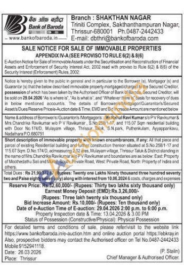 All that piece and parcel of existing Residential bulding and further construction thereon situated at S.No. 256/1-17 and 115.07 Sqm D No 174/D, admeasuring 2.02 ares, Mulayam village. Thrissur Taluk & District standing in the name of Mrs. Chandrika Ravikumarelo PV Ravikumar and boundaries are as below. East: Property of Moothedathu Sal and Mural, South: Private Road, West Private Road, North: Property of Indira and others