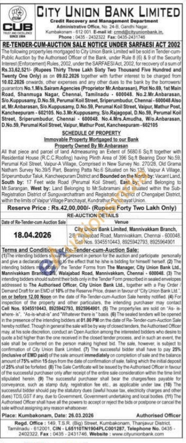 All that piece and parcel of land Admeasuring an Extent of 5680.6 Sqft together with Residential House (R.C.C. Roofing) having Plinth Area of 396 Sqft Bearing Door No 59. Perumal Koll Street, Vaipur-A Village, Comprised in New Survey No. 270/28, Old Grama Natham Survey No 39/5 Part. Bearing Patta No.6 Situated on No. 135, Vaipur A Village, Sriperumbudur Taluk, Kancheepuram District and Bounded on the North by: Vacant Land, South by: 17 Feet wide Road (Perumal Koll Street), East by: Land Belonging to Mr. Sarangan, West by: Land Belonging to Mr.Subramani and situated within the Sub Registration District of Sunguvarchattram and Registration District of Chengalpet District within the limits of Vaipur Village Panchayat, Kundrathur Panchayat Union