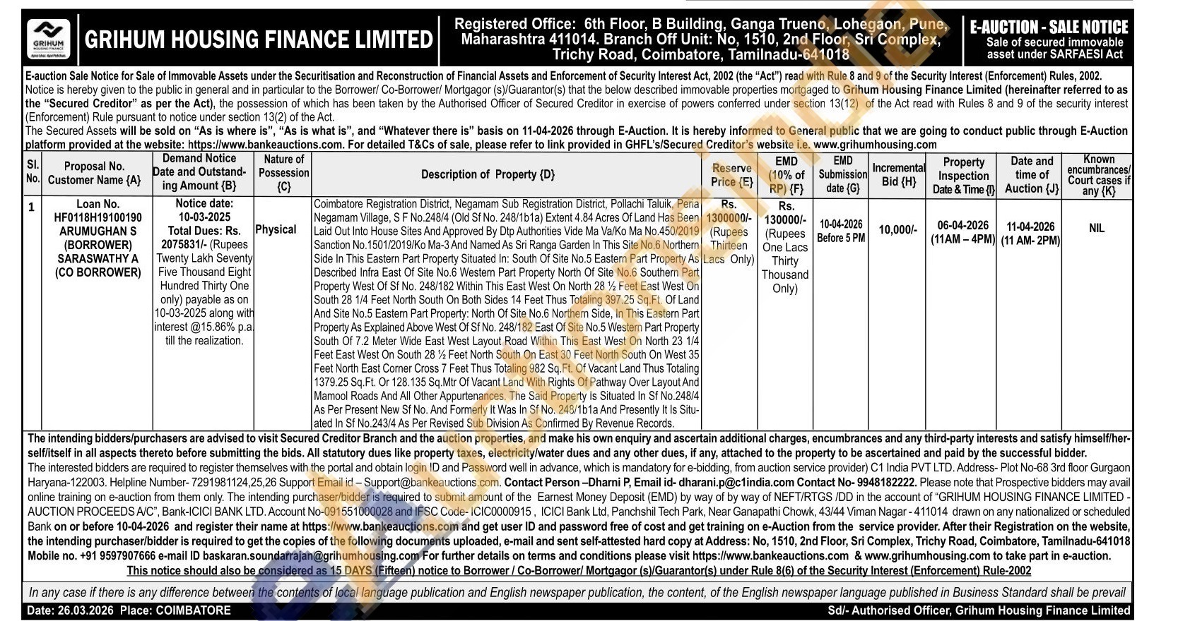 Coimbatore Registration District, Negamam Sub Registration District, Pollachi Taluik, Peria Negamam Village, S F No.248/4 (Old Sf No. 248/1b1a) Extent 4.84 Acres Of Land Has Been Laid Out Into House Sites And Approved By Dtp Authorities Vide Ma Vaiko Ma No. 450/2019 Sanction No.1501/2019/Ko Ma-3 And Named As Sri Ranga Garden In This Site No. 6 Northem Side In This Eastern Part Property Situated In: South Of Site No.5 Eastern Part Property As Described Infra East Of Site No.6 Western Part Property North Of Site No.6 Southem Part Property West Of Sf No. 248/182 Within This East West On North 28 % Feet East West On South 28 1/4 Feet North South On Both Sides 14 Feet Thus Totaling 397.25 Sq.Ft. Of Land And Site No.5 Eastern Part Property: North Of Site No.6 Northern Side, In This Eastern Part Property As Explained Above West Of Sf No. 248/182 East Of Site No.5 Western Part Property South Of 7.2 Meter Wide East West Layout Road Within This East West On North 23 1/4 Feet East West On South 28% Feet North South On East 30 Feet North South On West 35 Feet North East Corner Cross 7 Feet Thus Totaling 982 Sq. Ft. Of Vacant Land Thus Totaling 1379.25 Sq. Ft. Or 128.135 Sq.Mtr Of Vacant Land With Rights Of Pathway Over Layout And Mamool Roads And All Other Appurtenances. The Said Property Is Situated In Sf No.248/4 As Per Present New Sf No. And Formerly It Was in Sf No. 248/1b1a And Presently It Is Situ-ated In Sf No.243/4 As Per Revised Sub Division As Confirmed By Revenue Records.