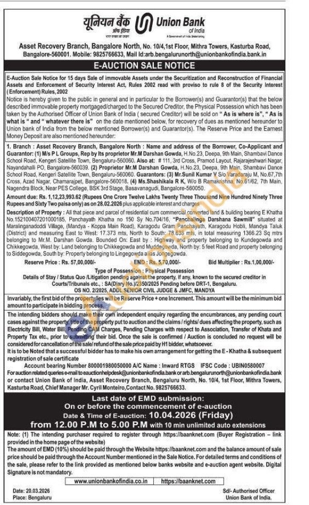Description of Property: All that piece and parcel of residential cum commercial converted land & building bearing E Khatha No. 152100407201000185, Panchayath Khatha no 150 Sy No.704/16, "Panchalinga Darshana Sawmill" situated at Maralinganadoddi Village, (Mandya Koppa Main Road), Karagodu Gram Panchayath, Karagodu Hobli, Mandya Taluk (District) and measuring East to West: 17.373 mts, North to South: 78.638 mts, in total measuring 1366.23 Sq mtrs belonging to Mr.M. Darshan Gowda. Bounded On: East by Highway and property belonging to Kundegowda and Chikkegowda, West by: Land belonging to Chikkegowda and Muddegowda, North by: 5 feet Road and property belonging to Siddegowda, South by: Property belonging to Lingegowda alias Jongegowda.