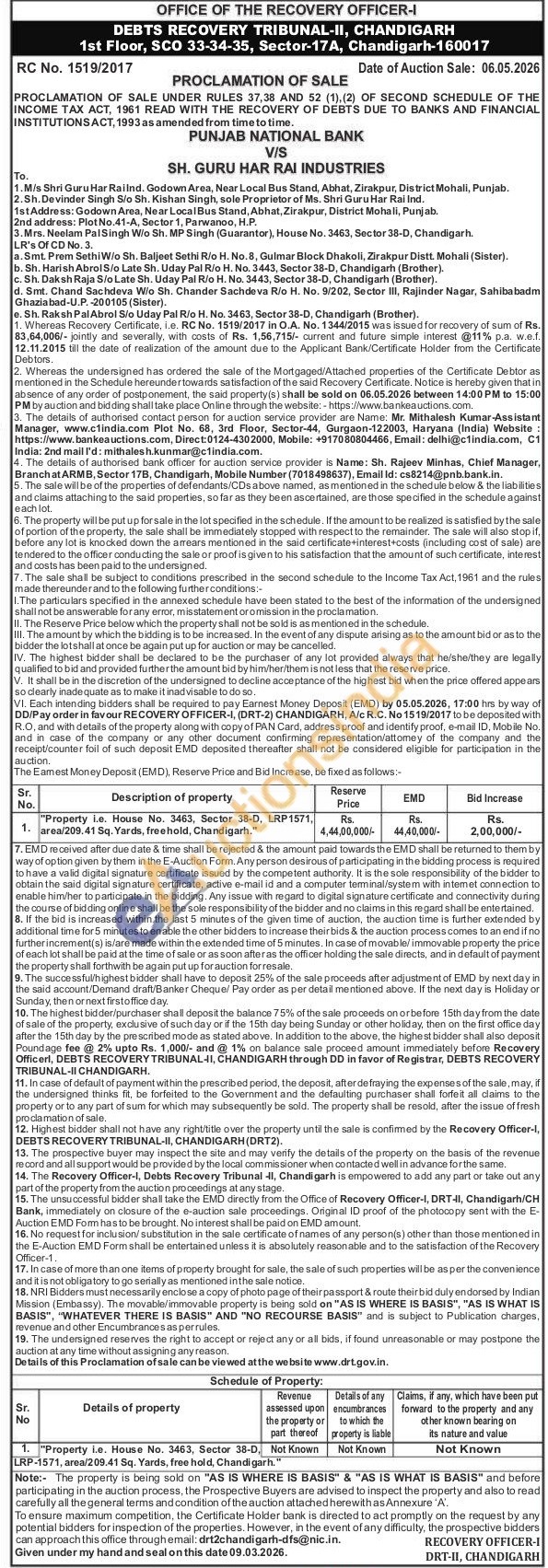 Property i.e. House No. 3463, Sector 38-D, LRP1571, area/209.41 Sq. Yards, freehold, Chandigarh."