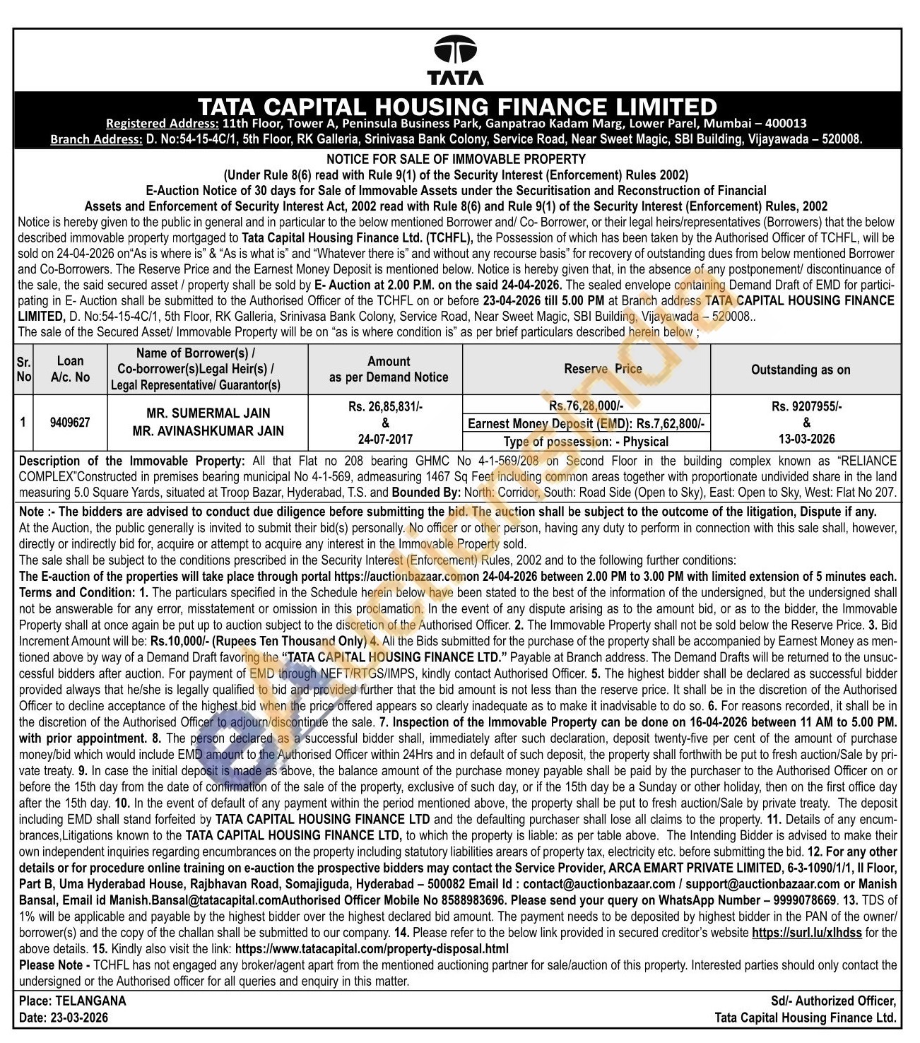 Description of the Immovable Property: All that Flat no 208 bearing GHMC No 4-1-569/208 on Second Floor in the building complex known as "RELIANCE COMPLEX Constructed in premises bearing municipal No 4-1-569, admeasuring 1467 Sq Feet including common areas together with proportionate undivided share in the land measuring 5.0 Square Yards, situated at Troop Bazar, Hyderabad, T.S. and Bounded By: North: Corridor, South: Road Side (Open to Sky), East: Open to Sky, West: Flat No 207.