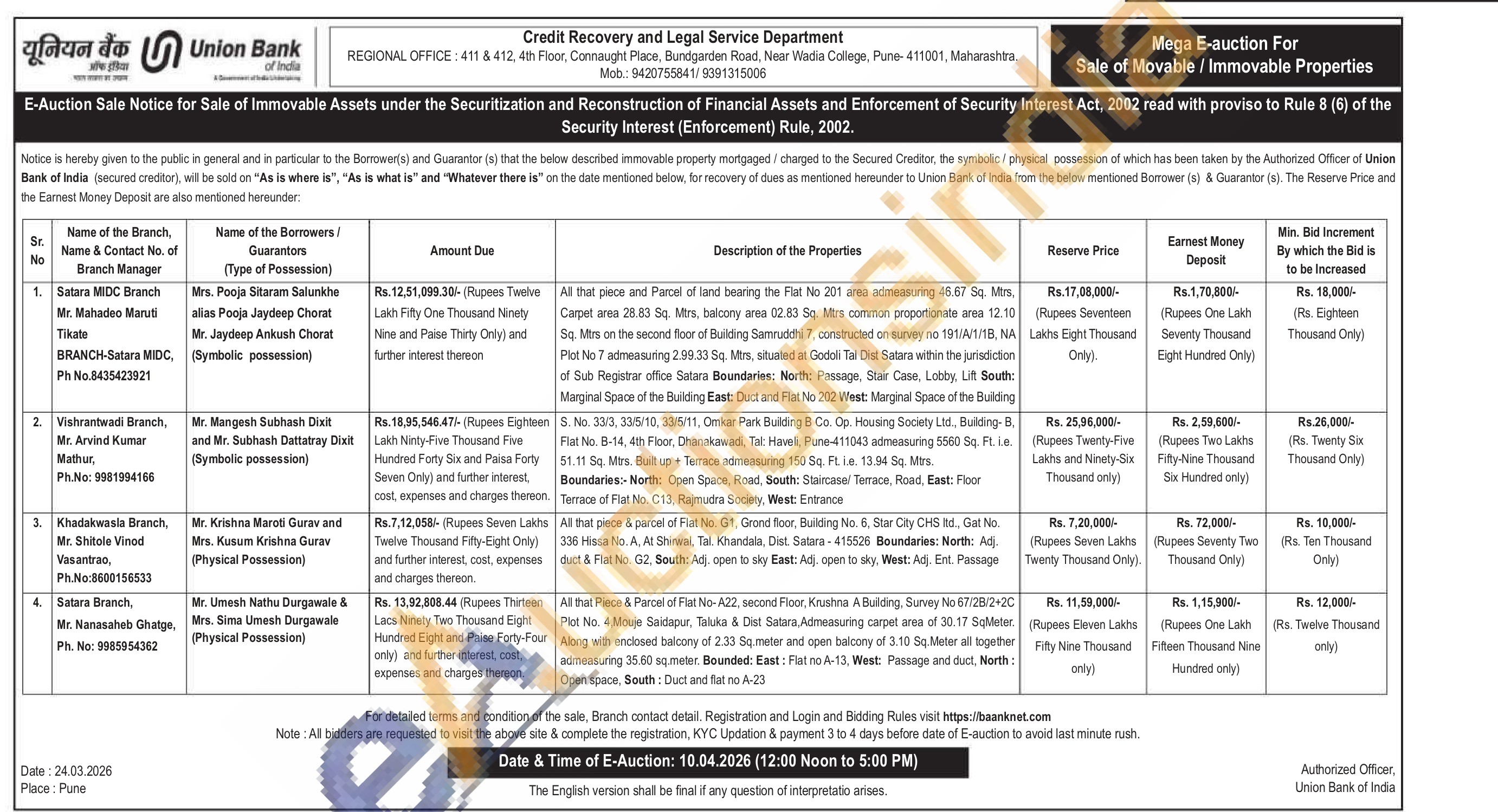 All that Piece & Parcel of Flat No-A22, second Floor, Krushna A Building, Survey No 67/2B/2+2C Plot No. 4, Mouje Saidapur, Taluka & Dist Satara, Admeasuring carpet area of 30.17 SqMeter. (F Along with enclosed balcony of 2.33 Sq.meter and open balcony of 3.10 Sq.Meter all together admeasuring 35.60 sq.meter, Bounded: East: Flat no A-13, West: Passage and duct, North: Open space, South: Duct and flat no A-23