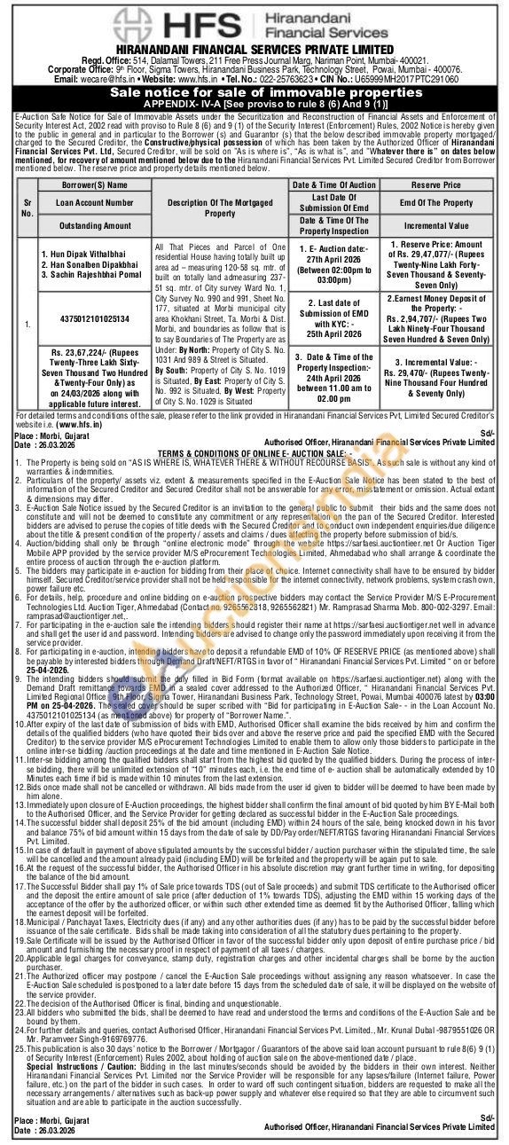 Authorised Officer Contact : Mr. Krunal Dubal-9879551026 / Mr. Paramveer Singh-9169769776