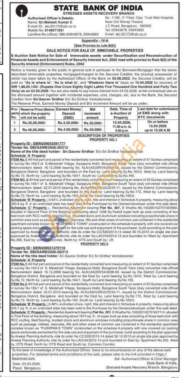 ITEM No.2: All that part and parcel of the residentially converted land measuring an extent of 25 Guntas comprised in survey No. 165/1 of S. Medahalli Village, Sarjapura Hobli, Bangalore South Taluk (duly converted vide official Memorandum dated: 22.07.2010 bearing No. ALN/(ASH)SR/22/2010-11, issued by the District Commissioner, Bangalore District, Bangalore and bounded on the East by: Land bearing Sy.No. 172, West by: Land bearing Sy No.72, North by: Land bearing Sy. No. 164, South by: Land bearing Sy No. 165/2 Schedule ''Property:0.89% undivided share, right, title and interest in Schedule A property, measuring about 545.7 sq. ft. in an undivided state has been sold to the Purchaser by the Owners/developer under this sale deed. Schedule C' Property: Residential Apartment bearing Flat No. 201, E Khatha No. 150200102701021114, situated in First Floor of the Building, measuring about 1674 sq. ft., of super built up area consisting of three bed room with RCC mofing, tiled flooring, molded doors and aluminum windows including proportionate share in common area such as passage, lobbies, staircase, lifts and other areas of common use contained tained in the residential apartment complex known as "PUSHPAM E TOWN" constructed on the schedule A property with one covered car parking space exclusively earmarked for the sole use and enjoyment of the purchaser, build according to the plan approved by Anekal Planning Authority vide its order No.CC/526/2013-14 dated 30.10.2013 on single site plan approved by Anekal Planning Authority vide its order No.LAO/34/2012-13 and bounded on East by: Apartment No.202. West by: OTS Road, North by: OTS Road and South by: Common Corridor