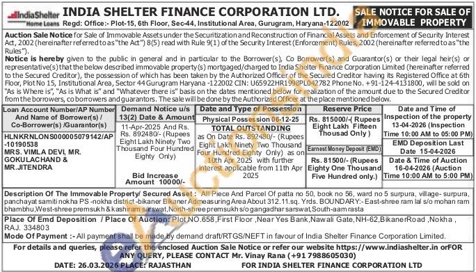 Description Of The Immovable Property/ Secured Asset: All Piece And Parcel Of patta no 50, book no 56, ward no 5 surpura, village-surpura, panchayat samiti nokha PS-nokha district-bikaner Bikaner Admeasuring Area About 312.11.sq. Yrds. BOUNDARY:-East-shree ram lal s/o mohan ram bhambhu, West-shree premsukh & kashiram sarswat, North-shree premsukh s/o gangadhar sarswat, South-aam rasta