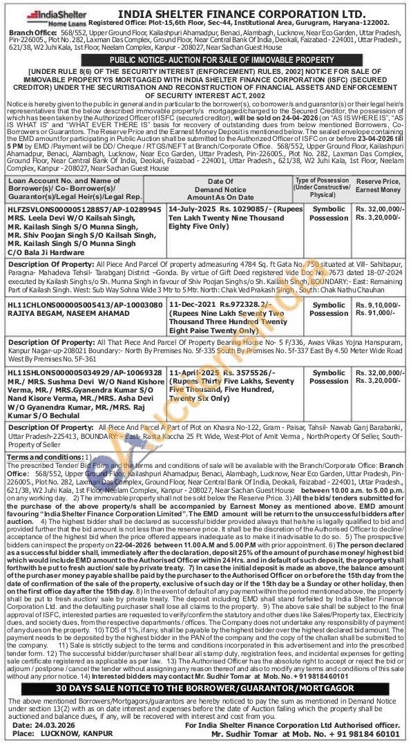 Description Of Property: All That Piece And Parcel Of Property Bearing House No 5 F/336, Awas Vikas Yojna Hanspuram, Kanpur Nagar-up-208021 Boundary:- North By Premises No. 57-335 South By Premises No. 5f-337 East By 4.50 Meter Wide Road West By Premises No. 5F-361