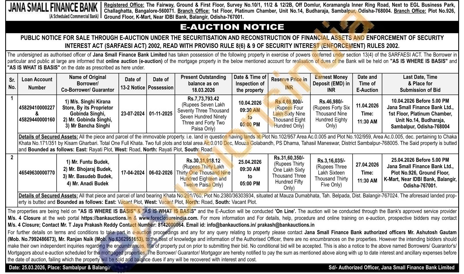 Details of Secured Assets: All that piece and parcel of land bearing Khata No.291/760, Plot No.2380/36303934, situated at Mauza Dumabhata, Tah. Belpada, Dist. Balangir-767024, The aforesaid landed prop-erty is butted and Bounded as follows: East: Vacant Plot, West: Vacant Plot. North: Road, South: Vacant Plot