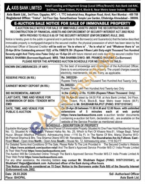 Equitable Mortgage Of All That Pieces And Parcel Of Immovable Propety Situated At One Free Hold Residential House No. 13. Situated At Village Bagli, Patwari Halka No. No. 25, Which is Part Of Khasra Nos 61, Village Bagli, Tehsil Huzur, Bhopal (Madhya Pradesh). Admeasuring Area-1116 Sq Ft. In The Name Of Mrs. Manju Sharma W/O-Mr. Pramod Sharma & Mrs. Tina Sharma Oberoi WIO Mr. Ranadeep Oberoi The Boundraries Are As Follows. East:-Road West: Open Area North:-Open Area South:-House No. 12. Admeasuring area-1116 SQ FT
