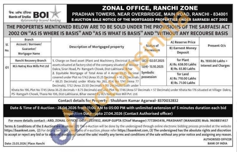 2. Equitable Mortgage of Total Area of 4 Acres 23.25 Decimal covered under Plot no 1742 (Area 35.25 Decimals +10.25 Decimals +68.25 Decimals) under Khata No 263, Plot No 1741 (Area 77 Decimals), 1752 (Area 23.50 Decimals + 50 Decimals) both under Khata No 196, Plot No 1745 (Area 36.25 decimals + 8.75 Decimals) and also Plot No 1746 (Area 57 Decimals + 57 Decimals) under Khata No 176 situated at Village-Dakra, PS-Ramgarh Chowk, Thana No 106, Dist-Lakhisarai, Bihar owned by M/s Natraj Rice Mill Pvt. Ltd.