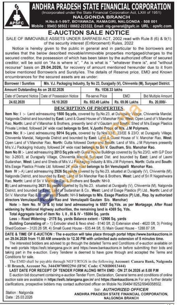 Item No: I: Land admeasuring 1500 Sq.yds, covered by Sy.No.23, at Durajpally Village, Chivvemla Mandal, Nalgonda District and bounded by East: Land & Guest House of V. Manohar Rao, West: Open Land of V.Manohar Rao, North: Land of V.Manohar & Brothers, presently land of V.Gautam and South: Shed of M/s. Essge Plastics Private Limited, followed 24' wide road belongs to Smt. V.Jyothi Propx of Mis. J.M Polymers. Item No: II: Land admeasuring 5014 Sq.yds, covered by Sy. Nos.23/E, 23/EE & 23/0, at Durajpally Village, Chivvemla Mandal, Nalgonda District and bounded by East: Land & Guest House of V. Manohar Rao, West: Open Land of V.Manohar Rao, North: Gutta followed Donka and South: Land of Mis. J.M Polymers presently M/s.V.J Packaging Industry, followed 24' wide road belongs to Sri V. Gautham, S/o. Manohar Rao. Item No III: Land admeasuring 2013 Sq.yds with Guest House Buildings covered by Sy. No.23/0, with GP Door No: 3-260/3, at Durajpally Village, Chivvemla Mandal Suryapet Dist. and bounded by East: Land of Laxmi Sudarshan, West: Land and Sheds of Mis. V.J Packaging Industry & M/s.J.M Polymers, North: Gutta and South: M/s. Essge Plastics Private Ltd. followed 24' wide road belongs to Sri Vemulapalli Manohar Rao. Item IV-A) Land admeasuring 2926 Sq.yards covered by Sy. No.23, situated at Durajpally (V), Chivvemla (M), Nalgonda District, and bounded by East: Land of Sri Manohar Rao & Brothers, West: Land of Sri R Nageshwara Rao, North: Land of Sri V Manohar Rao & Brothers and South: NH-9. B) Land admeasuring 3631 Sq.yards covered by Sy No.23, situated at Durajpally (V), Chivvemla (M), Nalgonda District, and bounded by East: Land of Sudarshan & Co., West: Land of Essge Plastics (P) Ltd., North: Land of Sri V. Manohar Rao & Brothers and South: NH-9 belongs to M/s. Essge Plastics (P) Ltd., Rep. by authorized directors Vemulapalli Manohar Rao and Vemulapalli Gautam S/o. Manohar
