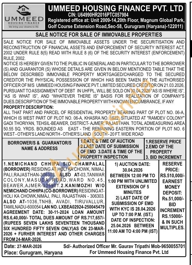 ALL THAT PART AND PARCEL OF RESIDENTIAL PROPERTY BEARING PART OF PLOT NO. 06-A, WHICH IS WEST PART OF PLOT NO. 06-A, KHASRA NO. 1622, SITUATED AT "RAMDEV COLONY" GADI THORIYAN, TEHSIL-BEAWER, DISTRICT-AJMER, RAJASTHAN. TOTAL ADMEASURING AREA 50.55 SQ. YRDS. BOUNDED AS EAST THE REMAINING EASTERN PORTION OF PLOT NO. 6 WEST-OTHER'S LAND NORTH-OTHER'S LAND SOUTH-20 FT. WIDE ROAD