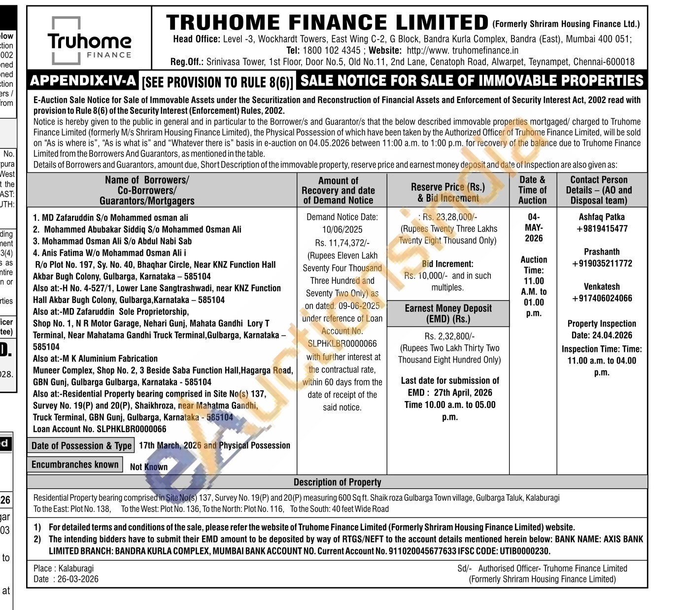Residential Property bearing comprised in Site No(s) 137, Survey No. 19(P) and 20(P) measuring 600 Sq ft. Shaik roza Gulbarga Town village, Gulbarga Taluk, Kalaburagi To the East: Plot No. 138, To the West: Plot No. 136, To the North: Plot No. 116, To the South: 40 feet Wide Road