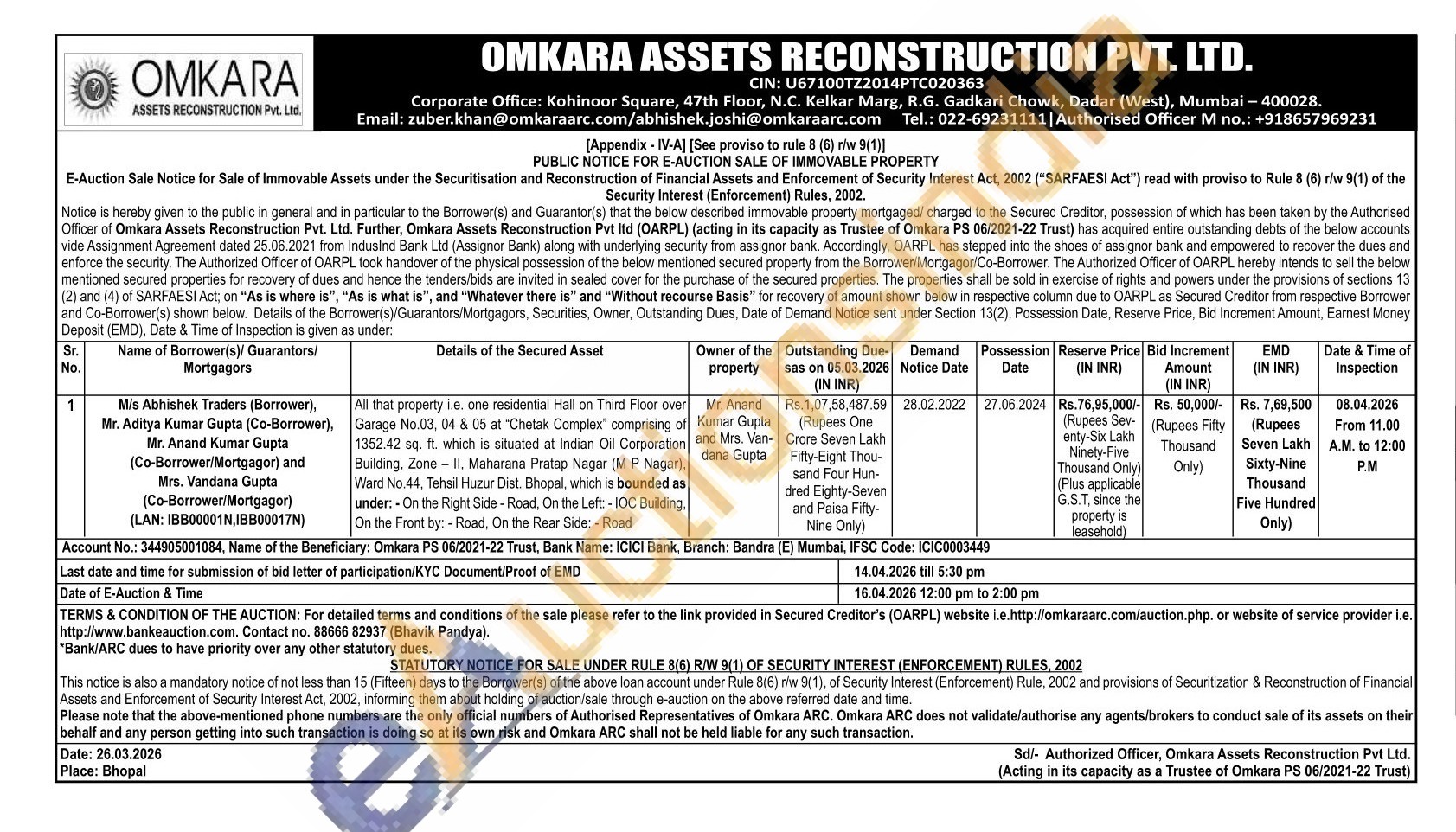 All that property.e. one residential Hall on Third Floor over Garage No.03, 04 & 05 at "Chetak Complex" comprising of 1352.42 sq. ft. which is situated at Indian Oil Corporation Building. Zone - II, Maharana Pratap Nagar (MP Nagar), Ward No.44, Tehsil Huzur Dist. Bhopal, which is bounded as under: On the Right Side-Road, On the Left: IOC Building, On the Front by: Road, On the Rear Side - Road