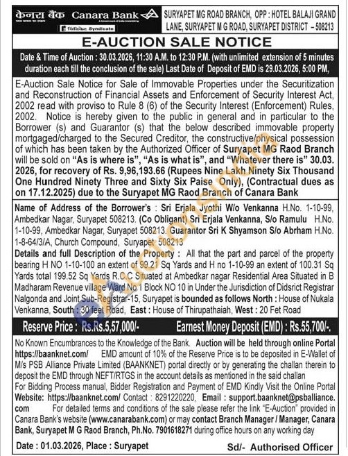 Details and full Description of the Property: All that the part and parcel of the property bearing H NO 1-10-100 an extent of 99.21 Sq Yards and H no 1-10-99 an extent of 100.31 Sq Yards total 199.52 Sq Yards R.C.C Situated at Ambedkar nagar Residential Area Situated in B Madharam Revenue village Ward No 1 Block NO 10 in Under the Jurisdiction of Didsrict Registrar Nalgonda and Joint Sub-Registrar-15, Suryapet is bounded as follows North: House of Nukala Venkanna, South: 30 feet Road, East: House of Thirupathaiah, West: 20 Fet Road