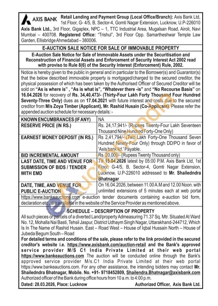 All such pieces or parcels of a diverted Land/property Admeasuring 71.37 Sq. Mtr. Situated At Ward No. 12, Mohalla Nai Basti, Tehsil Jaspur, District Udhaym Singh Nagar, Uttarakhand-244712, Which Is In The Name of Rashid Husain. East - Road West - House of Iqbal Hussain North - House of Jubeda Begum South-Road