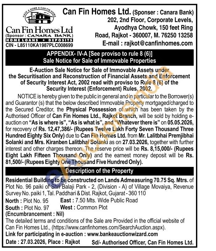 Contact no 76250 13258 E-mail: rajkot@canfinhomes.com