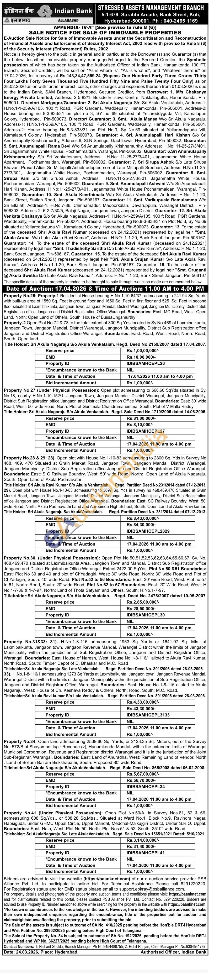Open Plot No.50,51,52,53,62,63,64,65,66,67, Sy. No. 468,469,470 situated at Laxmibaikunta Area, Jangaon Town and Mandal, District Sub Registration office Jangaon and District Registration Office Warangal. Extent 2422.00 SqYds. Plot No.50 &51 Boundaries: East: Plot No 39 and 40 and plot of ChYadagiri, West: 30' wide Road, North: 30' wide Road and Plot of ChYadagiri, South: 40' wide Road. Plot No.52 to 56 Boundaries: East: 30' wide Road, West: Plot no 57 to 61, North: Road, South: 20' wide Road. Plot No.62 to 67 Boundaries: East: 20' Wide Road, West: H No.1-7-86 & 1-7-97, North: Land of Thota Satyam and Others, South: H.No.1-7-97