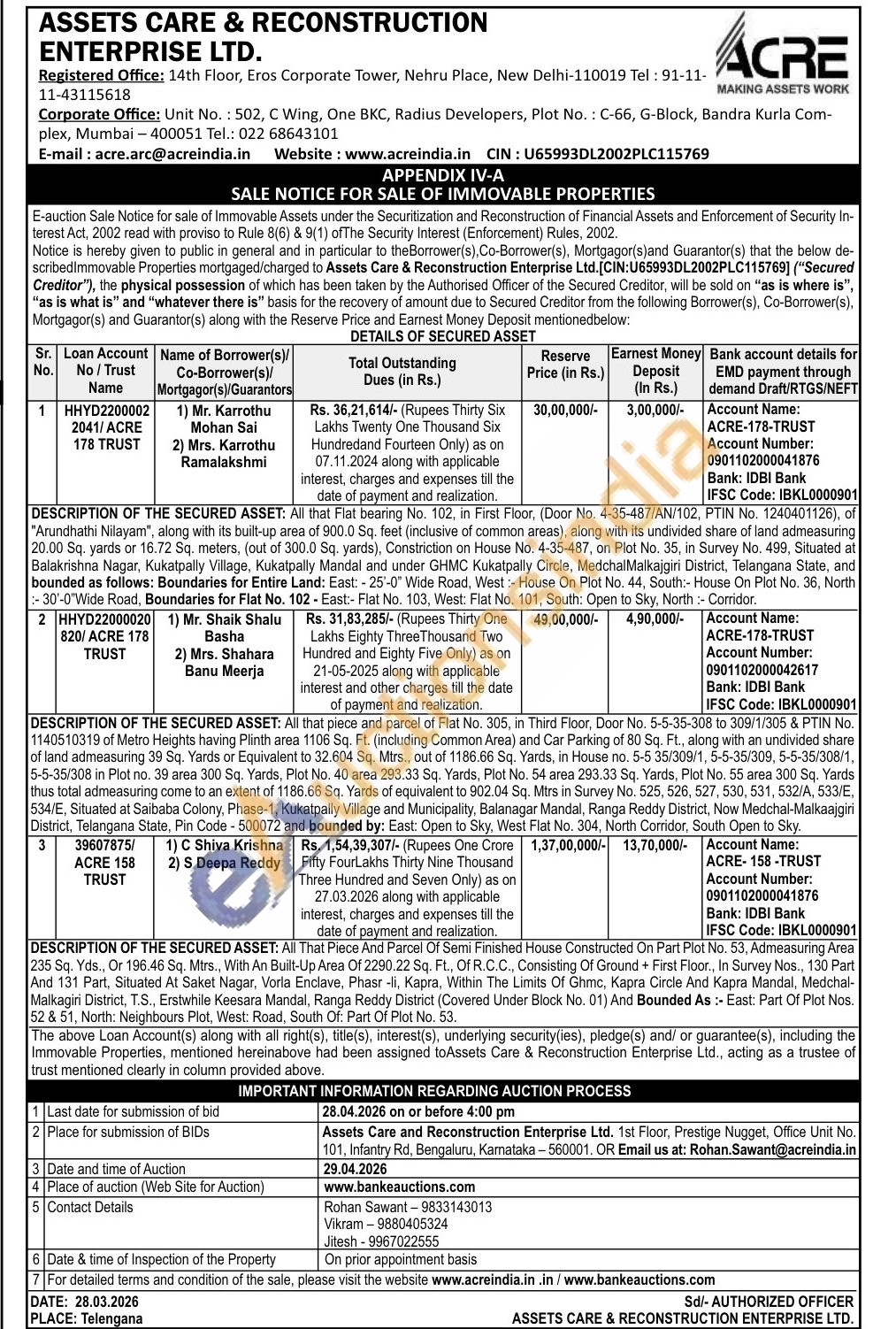DESCRIPTION OF THE SECURED ASSET: All that Flat bearing No. 102, in First Floor, (Door No. 4-35-487/AN/102, PTIN No. 1240401126), of "Arundhathi Nilayam", along with its built-up area of 900.0 Sq. feet (inclusive of common areas), along with its undivided share of land admeasuring 20.00 Sq. yards or 16.72 Sq. meters, (out of 300.0 Sq. yards), Constriction on House No. 4-35-487, on Plot No. 35, in Survey No. 499, Situated at Balakrishna Nagar, Kukatpally Village, Kukatpally Mandal and under GHMC Kukatpally Circle, Medchal Malkajgiri District, Telangana State, and bounded as follows: Boundaries for Entire Land: East: - 25'-0" Wide Road, West :- House On Plot No. 44, South:- House On Plot No. 36, North :-30'-0"Wide Road, Boundaries for Flat No. 102 - East:- Flat No. 103, West: Flat No. 101, South: Open to Sky, North :- Corridor.