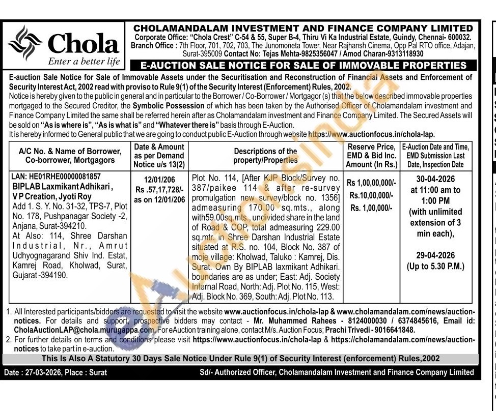Plot No. 114, [After KJP Block/Survey no. 387/paikee 114 & after re-survey promulgation new survey/block no. 1356] admeasuring 170.00 sq.mts., along with59.00sq.mts., undivided share in the land of Road & COP, total admeasuring 229.00 sq.mtr. in Shree Darshan Industrial Estate situated at R.S. no. 104, Block No. 387 of moje village: Kholwad, Taluko: Kamrej, Dis. Surat. Own By BIPLAB laxmikant Adhikari. boundaries are as under; East: Adj. Society Internal Road, North: Adj. Plot No. 115, West: Adj. Block No. 369, South: Adj. Plot No.