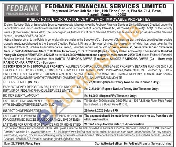 DESCRIPTION OF THE IMMOVABLE PROPERTY: ALL PIECE AND PARCEL OF MORTGAGED PROPERTY BEARING FLAT NO8 2ND FLR OM PEARL CO OP HSG SOC,SR ONS NR ABHINV COLLEGE NARHE PUNE, PUNE-411041. MAHARASHTRA, Bounded by: East PROPERTY OF SURYA, West-REMAINING PART OF SURVEYNO 8 OWNED BY MRAKHADE, North-PROPERTY OF MR JAGTAP, South-30 FEET ROADAND BEYOND THAT PROPERTY OWNED BY MR PATIL, NALAWADE AND MOHITE