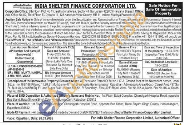 Description of the Immovable Property/ Secured Asset: All Piece And Parcel Of flat no. L17-A, Ground floor of the Narendera homes, chak 3rtp.a. no. 188/188, Killa no. 11,20,21 Murbba no.47, tehsil sangaria Hanumangargh Rajasthan Admeasung Area About-Carpet Area 497 Sq. Ft., Built Up Area 550 Sq. Ft. and Super Built Up Area 605 Sq. Ft Boundary-East-30 Ft Road, West-Flat No 112-A, North-Flat No.116-A. South Flat No.118-A
