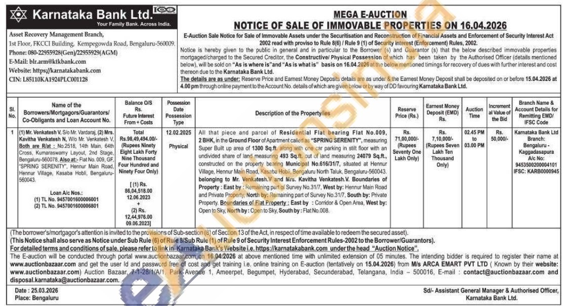All that piece and parcel of Residential Flat bearing Flat No.009, 2 BHK, in the Ground Floor of Apartment called as "SPRING SERENITY", measuring Super Built up area of 1300 Sq.ft. along with one car parking in stilt floor with an undivided share of land measuring 493 Sq.ft. out of land measuring 24079 Sq.ft. constructed on the property bearing Municipal No.616/31/7, situated at Hennur Village, Hennur Main Road, Kasaba Hobli, Bengaluru North Taluk, Bengaluru-560043 belonging to Mr. Venkatesh.V and Mrs. Kavitha Venkatesh.V. Boundaries of Property: East by: Remaining part of Survey No.31/7, West by: Hennur Main Road and Private Property, North by: Remaining part of Survey No.31/7, South by: Private Property. Boundaries of Flat Property: East by: Corridor & Open Area, West by: Open to Sky, North by: Open to Sky, South by: Flat No.008