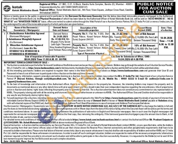 Authorised Officer Mr. Prashant Satpute on Contact No : 9724433999 / Mr. Ashok Motwani Contact No : 9873737351