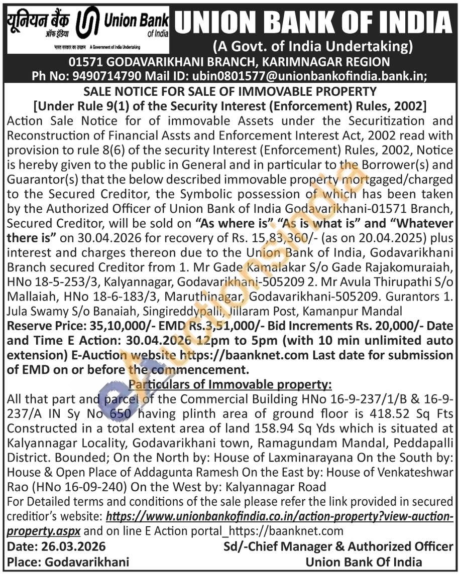 All that part and parcel of the Commercial Building HNo 16-9-237/1/B & 16-9-237/A IN Sy No 650 having plinth area of ground floor is 418.52 Sq Fts Constructed in a total extent area of land 158.94 Sq Yds which is situated at Kalyannagar Locality, Godavarikhani town, Ramagundam Mandal, Peddapalli District. Bounded; On the North by: House of Laxminarayana On the South by: House & Open Place of Addagunta Ramesh On the East by: House of Venkateshwar Rao (HNo 16-09-240) On the West by: Kalyannagar Road