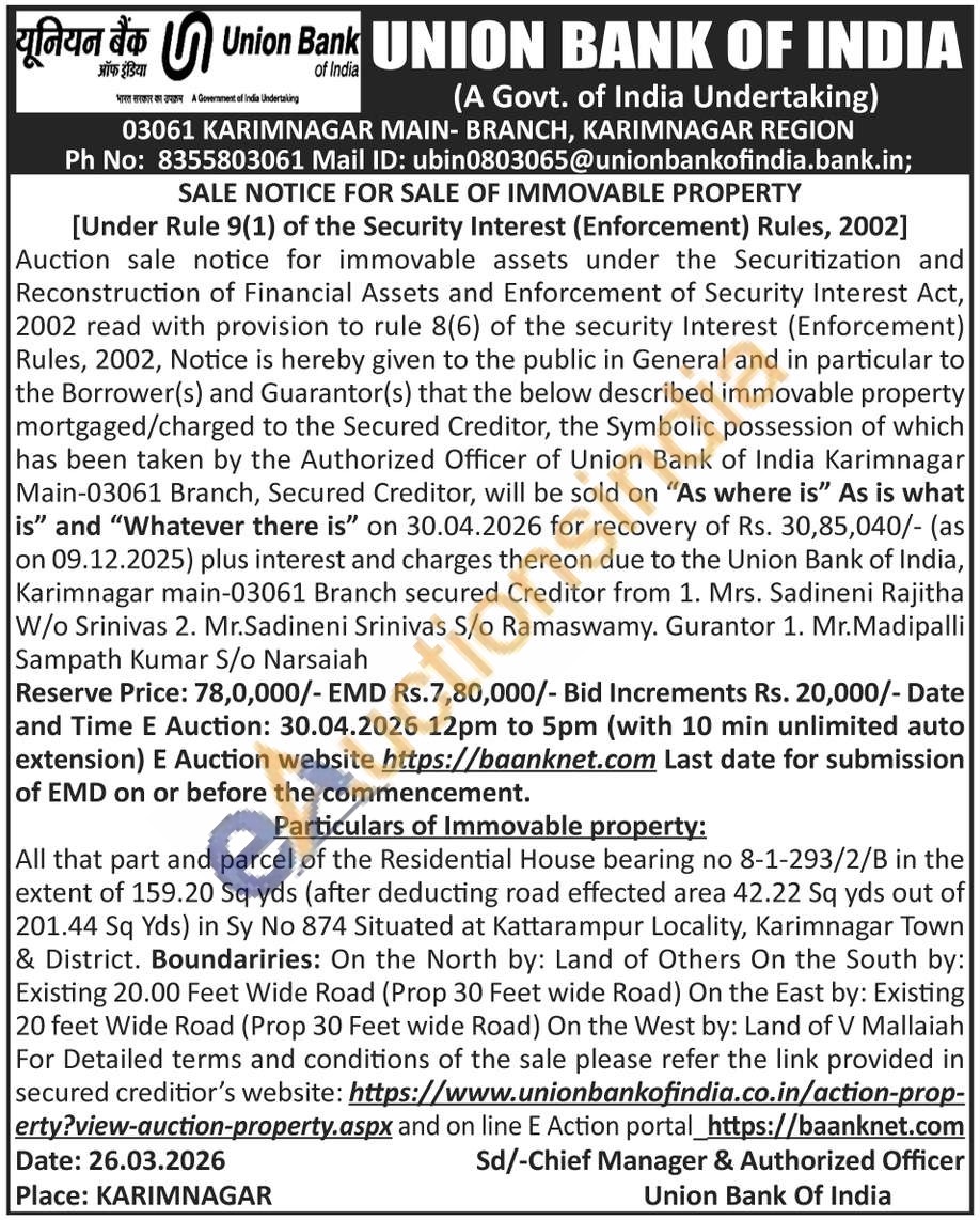 All that part and parcel of the Residential House bearing no 8-1-293/2/B in the extent of 159.20 Sq yds (after deducting road effected area 42.22 Sq yds out of 201.44 Sq Yds) in Sy No 874 Situated at Kattarampur Locality, Karimnagar Town & District