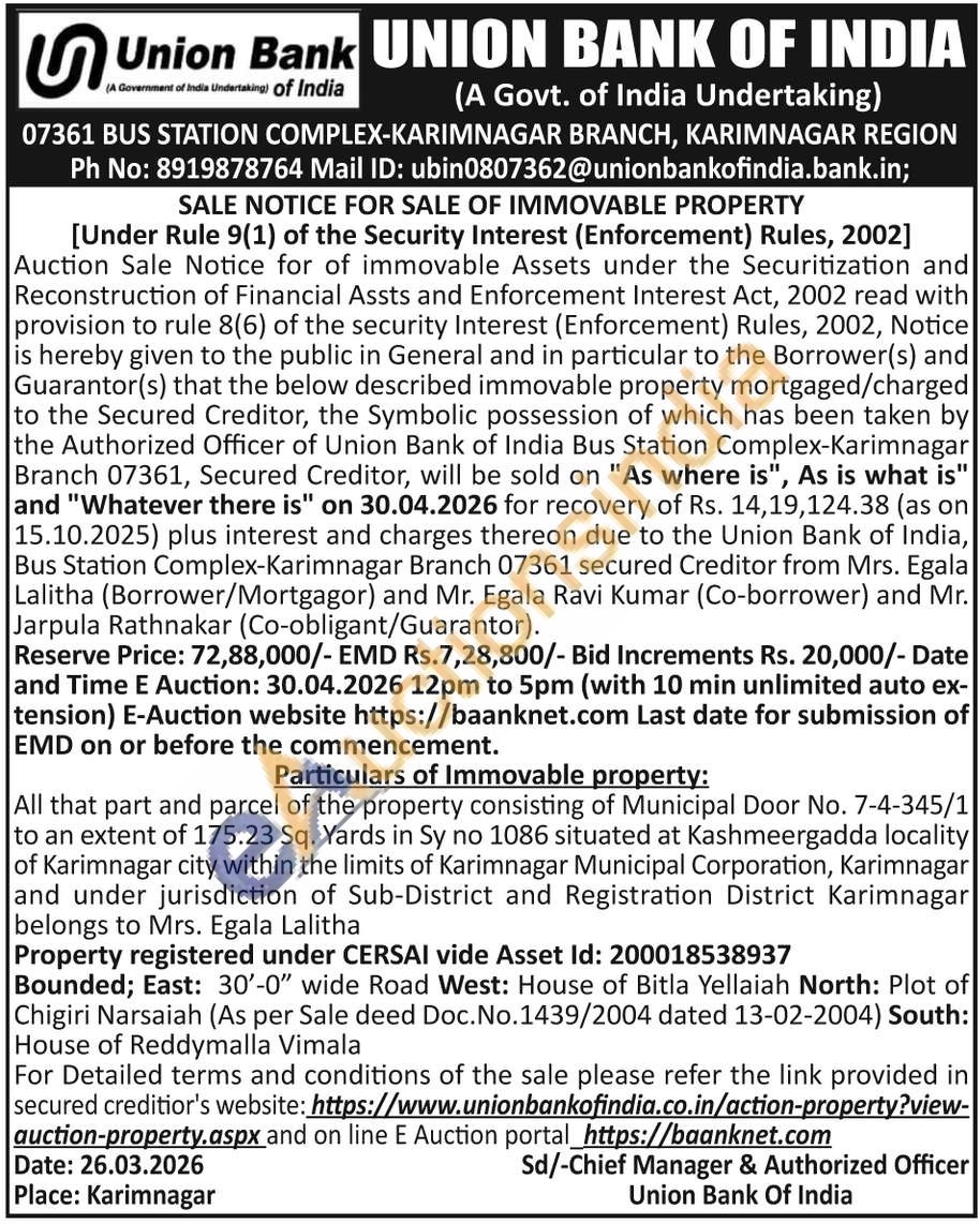 All that part and parcel of the property consisting of Municipal Door No. 7-4-345/1 to an extent of 175.23 Sq. Yards in Sy no 1086 situated at Kashmeergadda locality of Karimnagar city within the limits of Karimnagar Municipal Corporation, Karimnagar and under jurisdiction of Sub-District and Registration District Karimnagar belongs to Mrs. Egala Lalitha