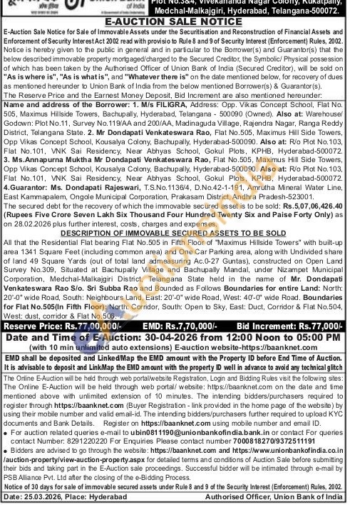 All that the Residential Flat bearing Flat No.505 in Fifth Floor of "Maximus Hillside Towers" with built-up area 1341 Square Feet (including common area) and One Car Parking area, along with Undivided share of land 49 Square Yards (out of total land admeasuring Ac.0-27 Guntas), constructed on Open Land Survey No.309, Situated at Bachupally Village and Bachupally Mandal, under Nizampet Municipal Corporation, Medchal-Malkajgiri District, Telangana State held in the name of Mr. Dondapati Venkateswara Rao S/o. Sri Subba Rao and Bounded as Follows Boundaries for entire Land: North: 20-0" wide Road, South: Neighbours Land, East: 20-0" wide Road, West: 40-0" wide Road. Boundaries for Flat No.505(In Fifth Floor): North: Corridor, South: Open to Sky, East: Duct, Corridor & Flat No.504, West: dust, corridor & Flat No.506
