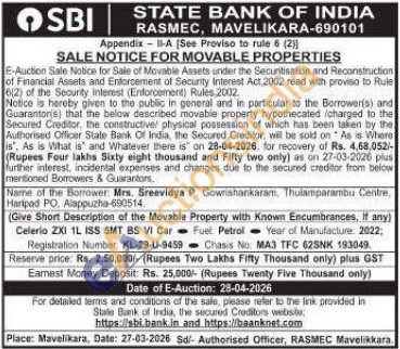 Give Short Description of the Movable Property with Known Encumbrances, If any) : Celerio ZXI IL ISS SMT BS VI Car Fuel Petrol Year of Manufacture: 2022, Registration Number: KL-29-U-9459 Chasis No: MA3 TFC 62SNK 193049