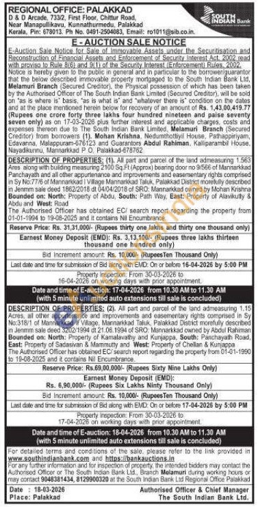 DESCRIPTION OF PROPERTIES: (1). All part and parcel of the land admeasuring 1.563 Ares along with building measuring 2100 Sq Ft (Approx) bearing door no 9/566 of Mannarkkad Panchayath and all other appurtenance and improvements and easementary rights comprised in Sy No: 77/6 of Mannarkkad Village Mannarkkad Taluk, Palakkad District District mon morefully described in Jenmm sale deed 1862/2018 dt 04/04/2018 of SRO, Mannarkkad owned by Mohan Krishna Bounded on: North: Property of Abdu, South: Path Way, East: Property of Alavikulty & Abdu and West: Road
