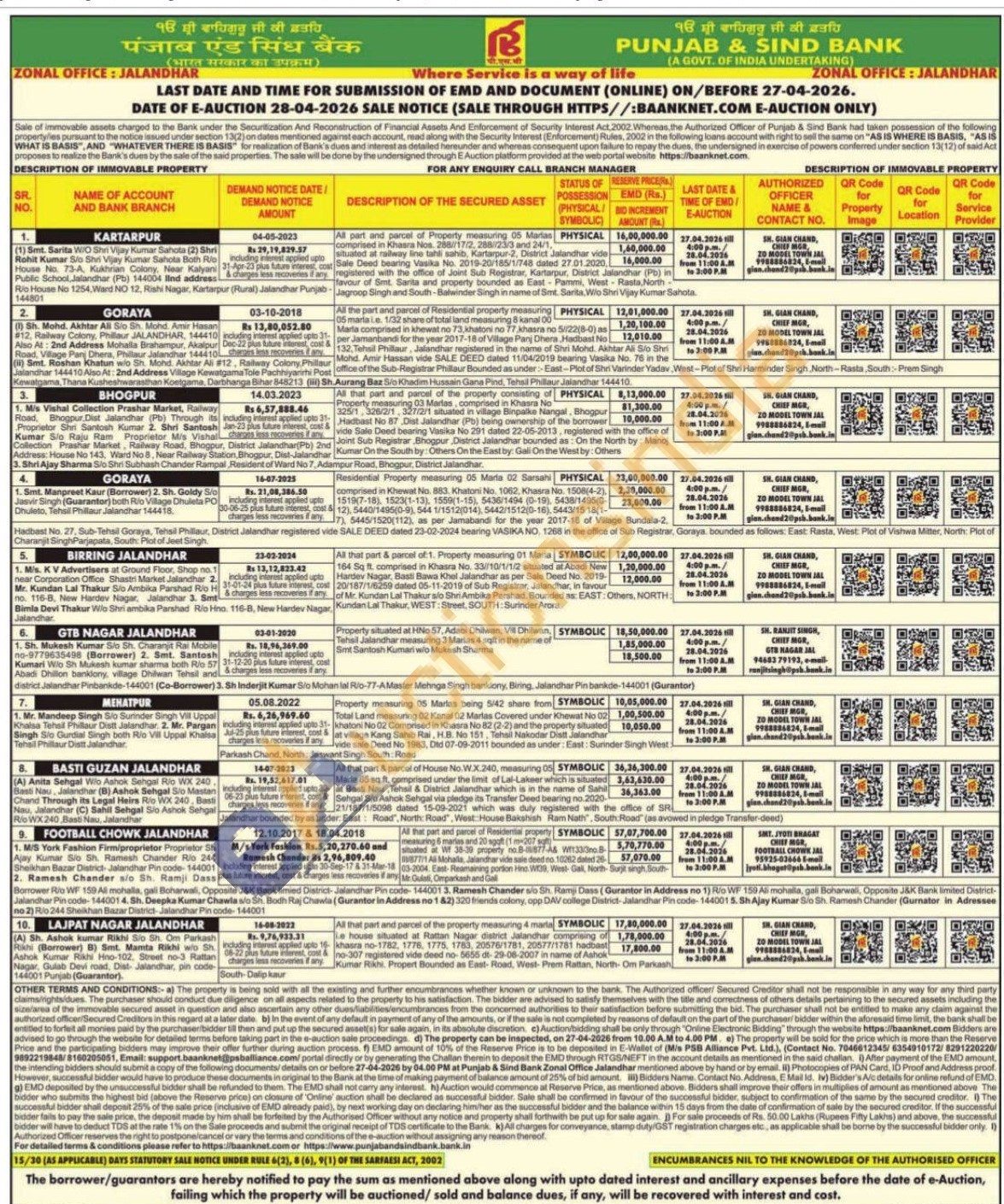 9.All that part and parcel of Residential property measuring 6 marlas and 20 sgoft (1 m-207 s situated at Wf 38-39 property no.8-877-AS W133/3no.8 087711 All Mohalla, Jalandhar vide sale deed no. 10262 dated 26. 03-2004. East-Remaining portion Hino W39, West- Gall, North-Surjit singh, South-Me Gulati, Omparkash and Gall